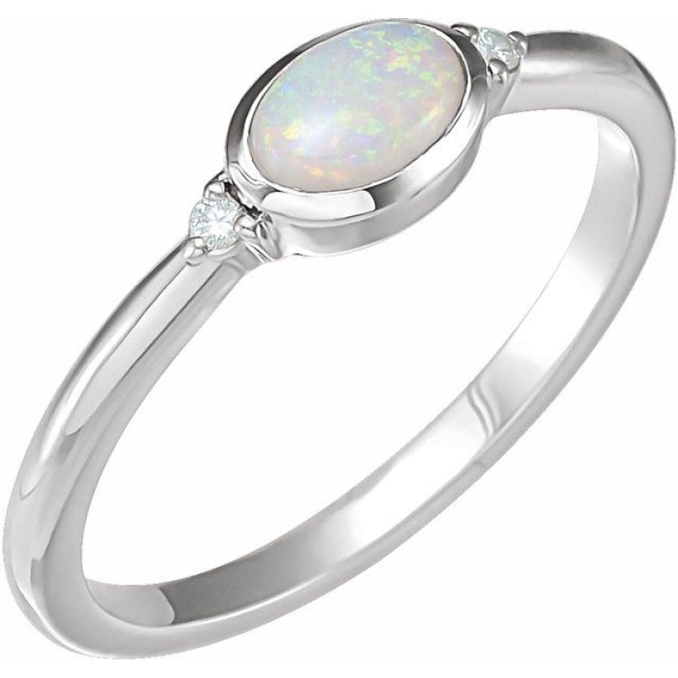 72315 / Ring / Set / Platinum / Natural White Opal / Oval / 5 X 3 Mm / Natural Diamond / Polished / Natural White Opal And .03 Ctw Natural Diamond Bezel-Set Cabochon Ring