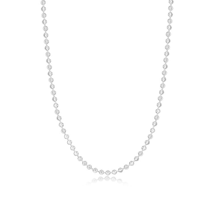 The Mona Chain is a delicate beaded necklace that adds subtle sophistication to any look. Crafted from sterling silver bonded with platinum, its fine bead design offers a minimalist yet elegant style, perfect for layering or wearing on its own. Measuring 20 inches in length and secured with a lobster clasp.